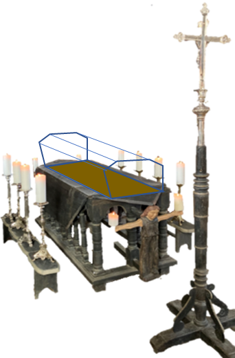 l’ensemble était replié, comme vous le voyez aujourd’hui. Sur les panneaux latéraux on peut encore voir l’Ankoù, l’ange de la mort, avec sa faux et un cartouche sur lequel on pouvait lire.