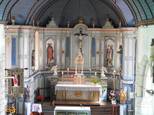Les boiseries servant de retables sont d’une unité de style Louis XVI. La restauration des années 1992 à 1995 a permis de retrouver leur magnifique polychromie d’origine depuis longtemps disparue. Le maître autel est surmonté d’un baldaquin, un ange orant est placé de chaque côté. Des niches dans les boiseries du chœur abritent St Yves, St Primel avec son bâton, St Michel terrassant un affreux diable et St Pierre qui a perdu ses clefs.