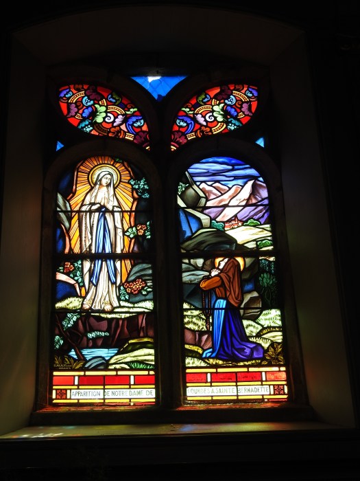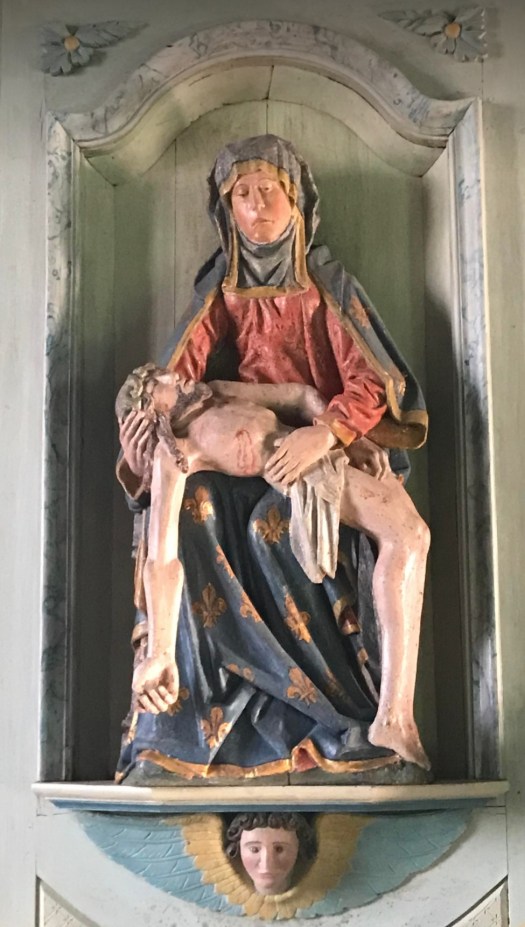 Dans le transept sud, l’autel de la Vierge est surmonté d’une belle statue de la Vierge de l’apocalypse, la lune sous ses pieds. Marie est heureuse de présenter son fils un tantinet espiègle. Les huit petites niches abritaient autre fois les petits saints. Seul St Chrysante qui a trouvé refuge dans sa fontaine a résisté au temps. Il est remplacé par une autre sculpture. On peut le voir actuellement à St Tugen.