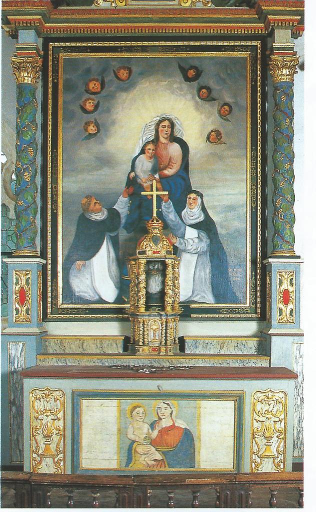 Autel de confrérie. Il est érigé par la Confrérie du Rosaire en 1659 et cache l’ancien autel de pierre. L’autel baroque et les colonnes du retable forment avec la vierge à l’enfant, de facture ancienne découverte en 1988, et le tableau de la remise du chapelet par Notre- Dame du Rosaire, offert en 1846, un ensemble composite qui témoigne de la permanence de la dévotion à la Vierge.