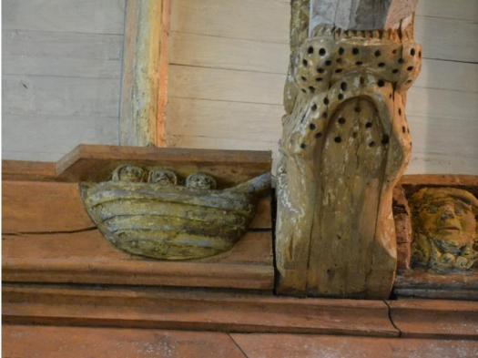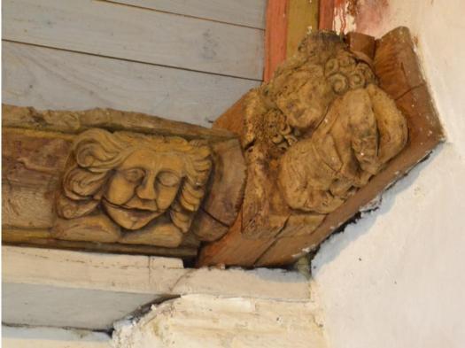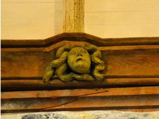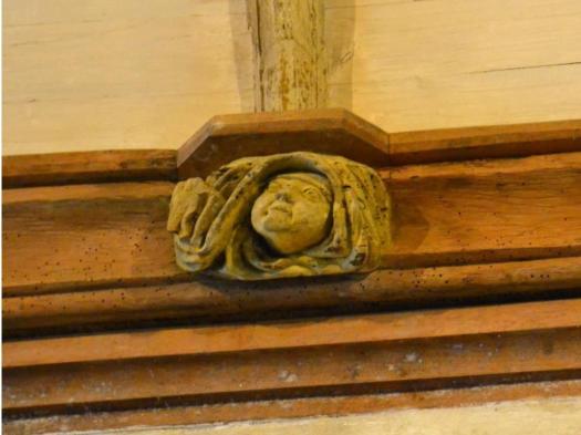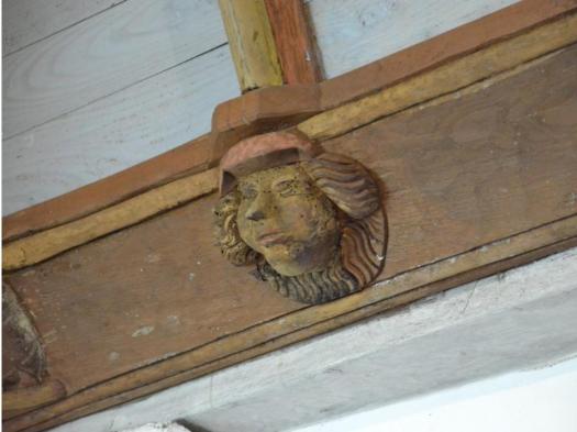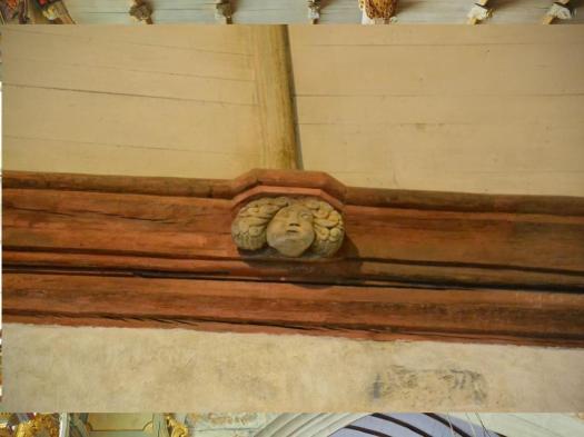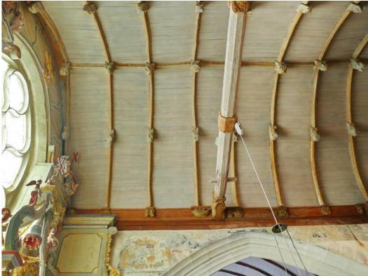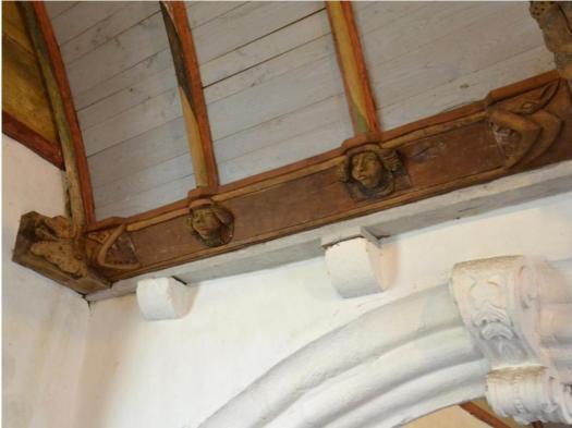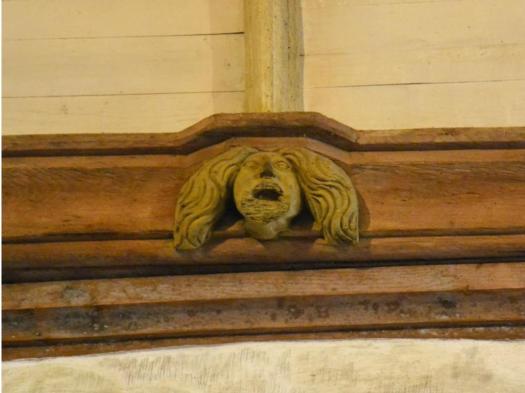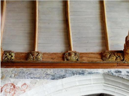 La nef lambrissée aux 48 pendentifs montrant quelques drôleries et des culots de poinçons dont certains sont armoriés.