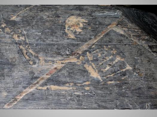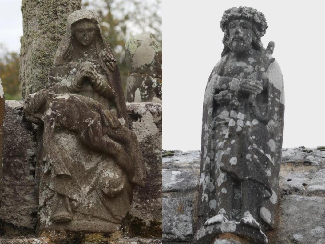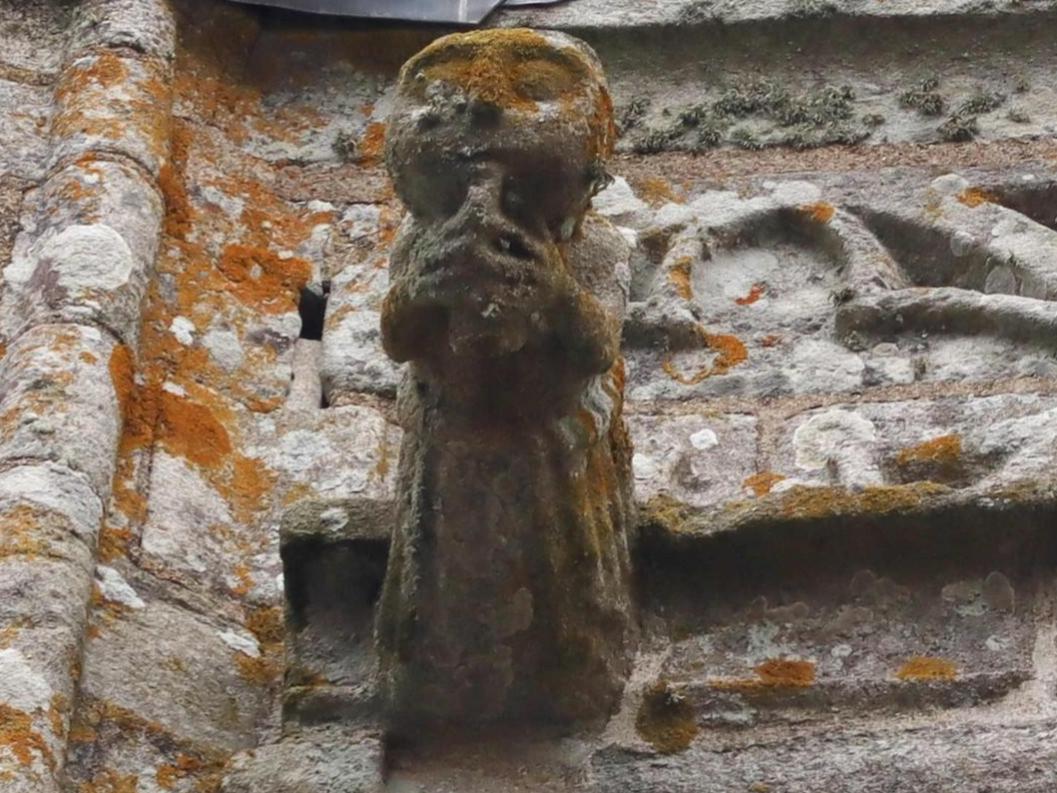 L’original catafalque, de 1642, est remarquable avec la représentation peinte de l’Ankou et de sa faux mais aussi à chaque extrémité les statuettes porte-cierges d’Adam et Eve accueillant le défunt.