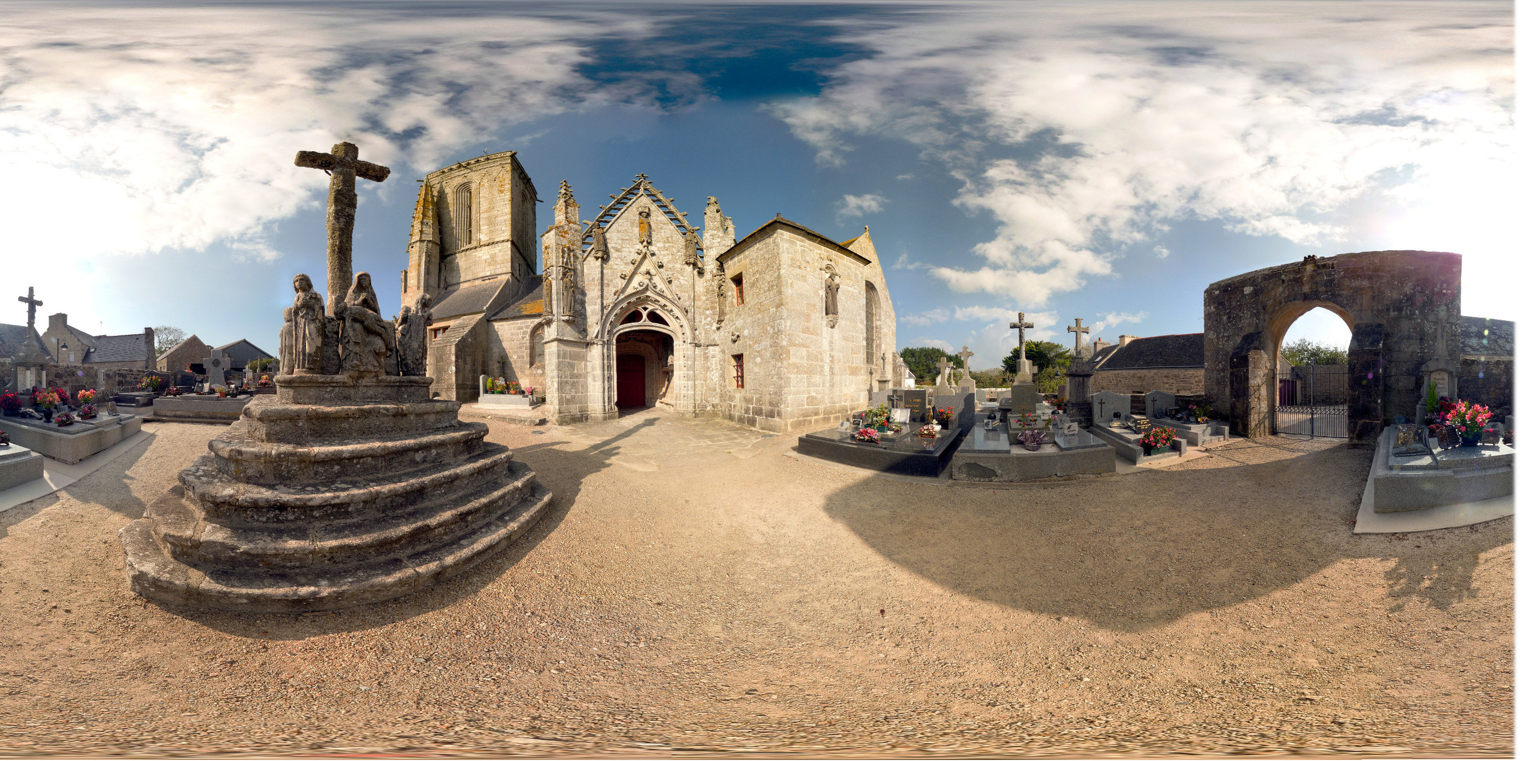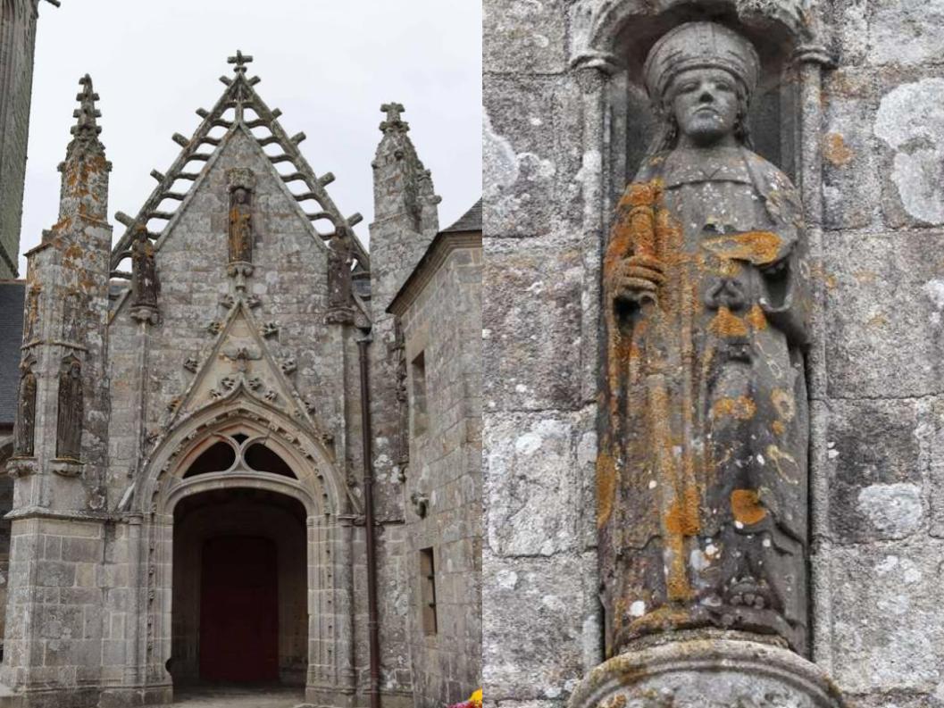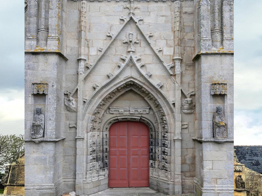 Edifiée dans son enclos paroissial, protégée dans son placître par son mur d’enceinte et sa porte triomphale ouvrant sur son calvaire et son cimetière, la chapelle d’architecture gothique au chevet plat, est remarquable par son double transept nord et sa tour massive à l’instar de Locronan ou encore St Herbot. La grande verrière du transept sud baigne l’intérieur d’une agréable lumière. La statuaire en Kersanton de l’enclos paroissial, 26 statues, est l’œuvre du grand maître de Plougastel. A quelques pas de là, sa fontaine miraculeuse vous révèlera son diagnostic si vous vous y mirez.