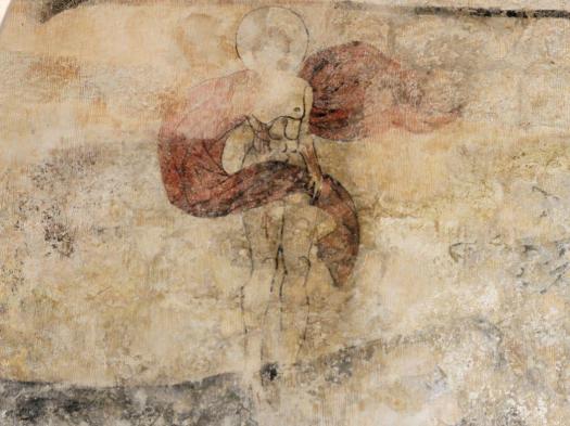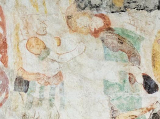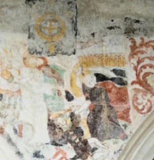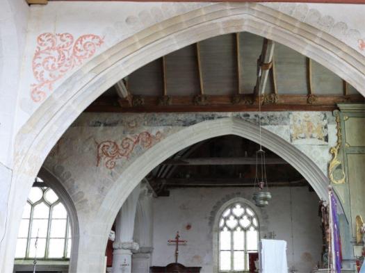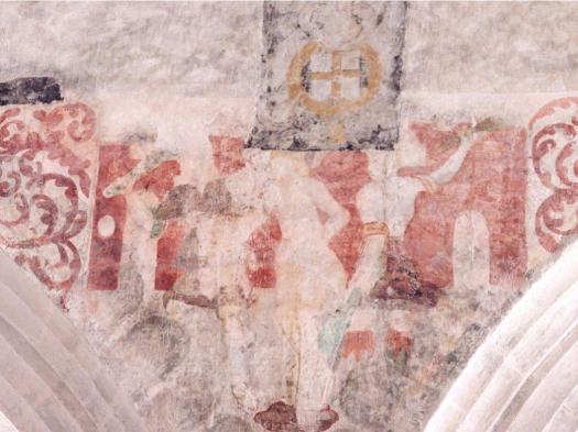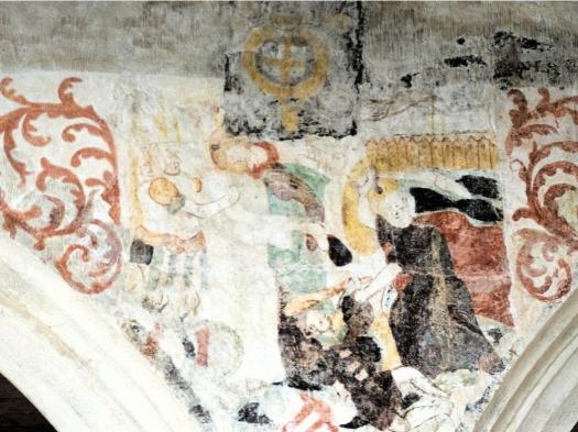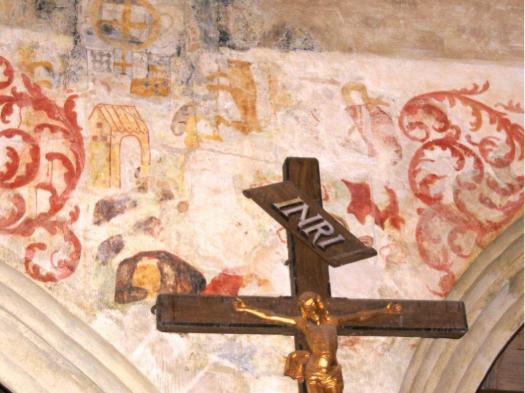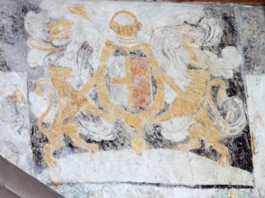 Sur les murs de la nef les litres funéraires sont bien visibles avec des armoiries peintes. Des fresques murales, encadrées de rinceaux, ornent les murs : la Cène, l’agonie du Christ, le baiser de Judas, la flagellation et la résurrection.